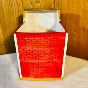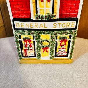 Charming Yankee Candle “General Store” ceramic jar house made exclusively for Yankee Candle. Features a bright red and yellow two-story general store decorated for the holidays with wreaths, garland, and bows. Can be used as a candle jar holder, decor piece, or part of a Christmas village display.