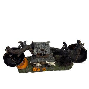 This spooky candle burner features a haunted house with playful ghosts, pumpkins, and a black cat. Ideal for a Halloween atmosphere.