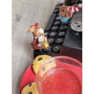 Product mouse in green sweater hand broken off as well as foot, red dress mouse left ear broken off, small chip on back on type writer, mild scratches and marks but otherwise in good condition