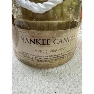 Includes 4 Apple Pumpkin scented tea candles. Measures 7.5 inches tall. In case, unopened sealed.