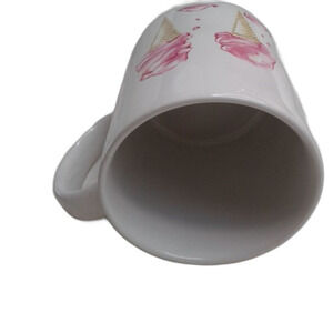 Approximately 11 oz. standard size coffee/tea mug featuring ice cream cones filled with pink ice cream, printed across entire outside of mug with cones progressively melting.