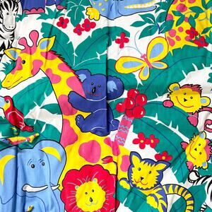 From Yankee Lady Creations. Handcrafted in Vermont. Baby bunting blanket new old stock with four uses - blanket, baby wrap, wall hanging or stroller wrap. Comes with original tags. Fabric box quilted design in colorful colorway on one side and vibrant zoo animals lions giraffe monkeys jungle elephant on the other. New deadstock Original macys tag attached.