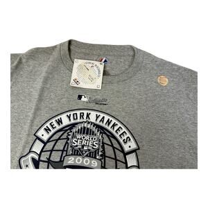 The product is an officially licensed Yankees 2009 World Series Champions shirt in size medium. It features Derek Jeter, a legendary player for the New York Yankees, and is part of the Major League Baseball (MLB) championship celebration. This gray shirt from Majestic is perfect for male fans looking to commemorate the historic win and show their support for the team. With a hologram for authenticity, this shirt is a must-have for any Yankee fan or collector seeking to celebrate the team's 27 world series titles.