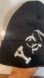 Stylish black beanie featuring bold white lettering. Perfect for keeping warm and adding a trendy touch to any outfit.
