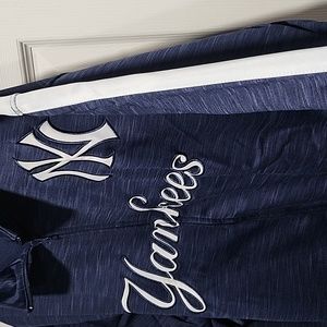 Yankee jacket navy with white writing and white line down sleeves. made by MLB. soft fabric and 2 front pockets. Never worn, slight wrinkles from being folded.