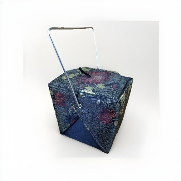 Stylish and unique statement purse designed to resemble a classic takeout box. Features a retro-inspired design with a solid exterior accented by a multicolor brocade pattern for an elegant touch. Made from durable nylon polyester material with a sleek black handle and strap for easy carrying. Includes a built-in mirror accessory for added convenience — perfect for fashion lovers who enjoy bold and playful designs.