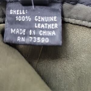 Yansi Fugel button up shirt. Super soft, thin dark olive green leather suede with snap closures, 3/4 sleeves, raw hems. Small white mark on sleeve as pictured - I did not attempt to remove. Overall very good preowned condition, Size: XL.