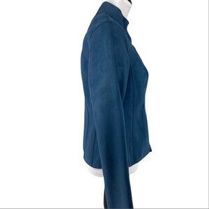Yansi Fugel size small jacket, it has a stand-up color, full zip front closure, gold hardware, long sleeves, lined, soft thick fabric, color midnight black but looks blue, lining is microfiber and shell is bonded moleskin which feels similar to suede. Care machine wash cold line dry. Materials 97% polyester, 3% spandex and 100% microfiber. RN#73590. Condition is new with tags as shown in the photos. Please preview the measurements to ensure fit.