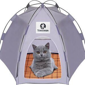The Yanvega Cat Tent is a cozy gray cave bed made of polyester, designed for indoor or outdoor cats. It measures 23.6 inches in length, 23.6 inches in width, and 16.8 inches in height. Perfect for giving your feline friend a secure and comfortable place to rest and relax.