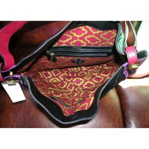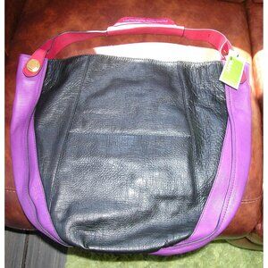 This Yany hobo bag, with its bold black and purple leather exterior, provides a stylish option for carrying essentials. The spacious interior and gold turn lock closure add utility and flair.