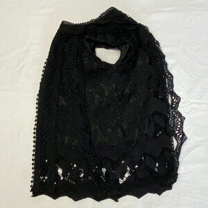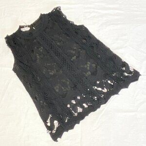Sleeveless All Over Lace Openwork Crochet Lined Tunic Top from Yaostar. Lovingly worn, not torn or stained - looks like new. Sleeveless lined open crochet lace with high scoop neck. Keyhole back opening with button closure. Relaxed A line style in solid black. Extra wide lightly ruffled band runs front to back along shoulder line. Lining about 5” shorter than scalloped hem. Hits below hips. Disclosure: Lining lower front has a few runs – does not affect wearability. Note: Some photos edited to enhance details - top is solid black. A versatile piece for boho lovers or anyone who appreciates feminine detail.