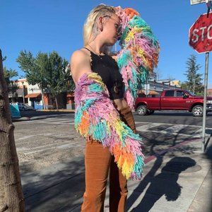 You'll be the star of the party in this unforgettable festival pastel rainbow yarn coat! Model wearing size Medium.