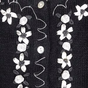 Yarnworks Cardigan Button Front Sweater Floral Embroidered Black White Medium