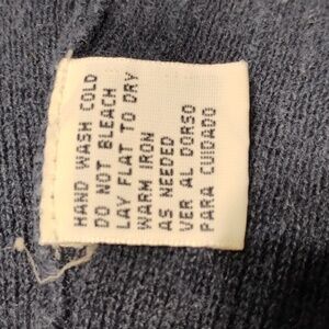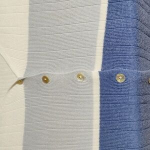 this is a very pretty sweater by yarn works it's probably vintage era nice v-neck it is in the color of off-white light blue with a white line then a Wedgewood type blue and a white line and then a dark blue at the bottom it has Pearl essence plastic like buttons going all the way up and in the front bottom it has a little v cut out in the center short sleeve extremely soft very lightweight made from 55% ramie in 45% cotton it's a size large it's extremely stretchy the measurements lying flat are approximately from pit to pit 23 in with some stretch you could add and the length from the shoulder down 24 in really pretty sweater it's got the nice horizontal knit