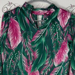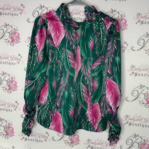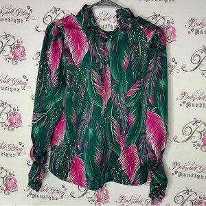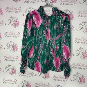 Vibrant blouse with a tropical leaf pattern. Features shades of green and pink. Perfect for a bold look. Cinch cuffs. Very soft and buttery. Small. Get ready for an abundance of compliments! π Youβll be celebrated for your exceptional taste! π