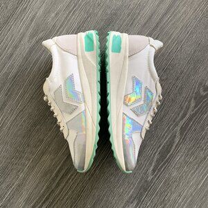Chunky White sneaker, iridescent silver lizard embossed trim, suede patching on heel-teal accent on sole and heel, white and black laces
