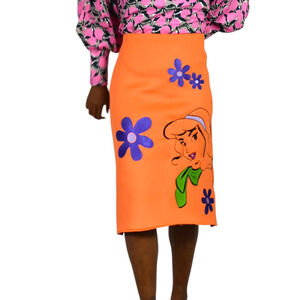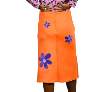 Get ready to solve some mysteries in style with this incredibly fun and unique Scooby Doo themed Daphne Blake pencil skirt by Yaya's Designs (appears homemade). This vibrant orange midi length skirt features an embroidered depiction of Daphne Blake from Scooby-Doo on the front complemented by purple flowers. The back also features the purple flowers giving it a playful, retro look. Zipper back closure.