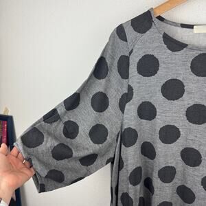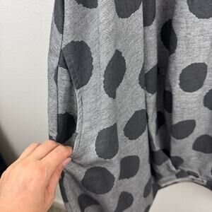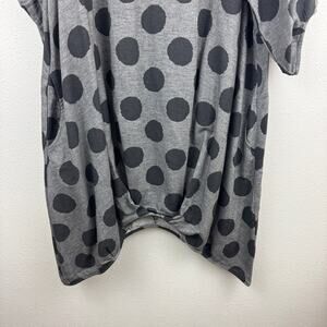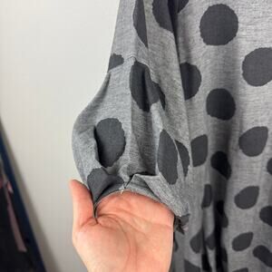 100% cotton, gray with black polka dots, half sleeves, pockets, asymmetrical hem, relaxed fit, size S/M.