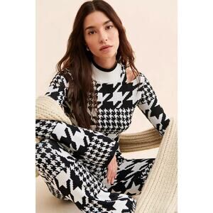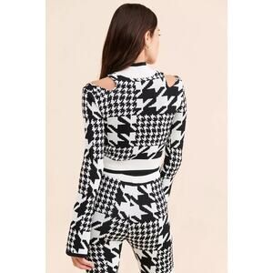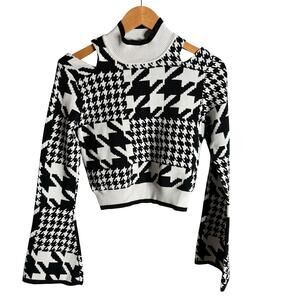 Year Of Ours Houndstooth Winter Mock Neck Sweater in Black / White. Size M / Medium. Features mock neck, bell sleeves, shoulder cutout detail, houndstooth print, ribbed trims, jacquard knit fabric, and cropped length. 65% Viscose, 35% Nylon. Excellent condition, no flaws.