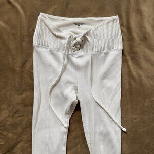 An angled high waist meets an adjustable lace-up front finished with vertical piping. In our Spandex Active Rib.