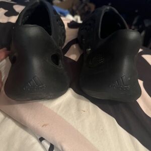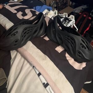 Sleek black Yeezy sandals. Modern design with cut-out details. Comfortable and stylish.