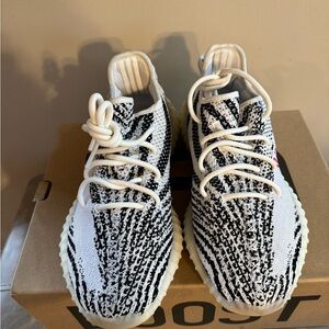 Bold Yeezy sneakers with striking black and white pattern. Red text adds a vibrant touch. Excellent condition.