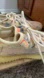Dynamic Yeezy sneakers with a blend of cream, orange, and blue hues. Stylish and bold design.