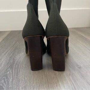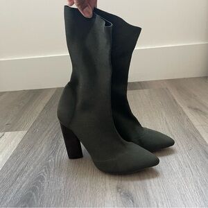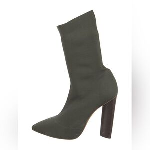 Green Knit Low Boots by YEEZY Season 2. These calf-high stretch knit boots in 'dark olive' green feature a pointed toe and a stacked brown heel. Tan leather sole. Tonal stitching. 4.25" heel. Great used condition. Minor scuffs on the heel, but nothing noticeable.