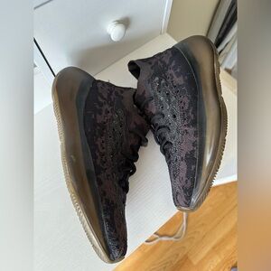 Stylish Yeezy sneakers. Black and gray knit design. Comfortable and trendy.