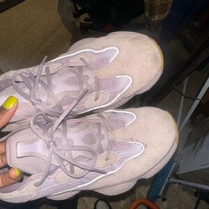 Stylish Yeezy sneakers. Light purple and beige tones. Comfortable and trendy design. Size 9 in men