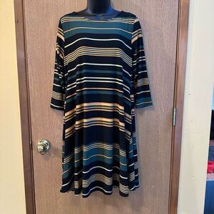 Dress multi colored stripes including Greens, oranges, white, teal, and black. It is very soft; made with polyester and spandex. Sleeves are ¾ sleeve. Dress flows very nicely. Has never been worn. Still in excellent condition