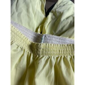 Lightweight yellow wide leg lounge pants with elastic waist and delicate ruffle trim at hem. Semi-sheer fabric with soft flowy drape. In very good vintage condition.