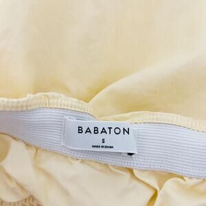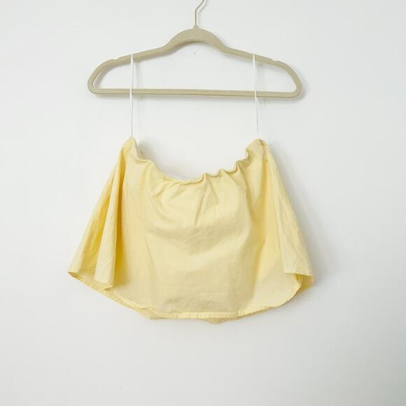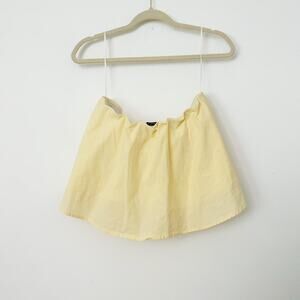 Pastel yellow flowy sleeveless tube top crop top with ruched/shirred bust and flowy ruffle overlay accent. Super cute for the spring and summer.