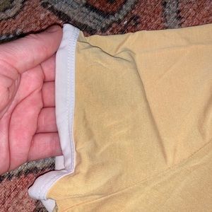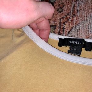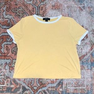 Yellow basic t-shirt that is slightly cropped with white edges. From Forever 21, size says 0X, but fits like a small! Only worn a couple of times, basically brand new.