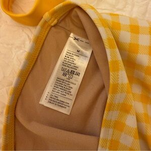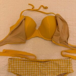 Stylish yellow bikini set with a solid top and checkered gingham bottom. The top is a wrap top that wraps around and ties in the back. Has a full underwire lining under the wrap. Please note that the adjustable halter strap on the top has been cut to make 2 straps.