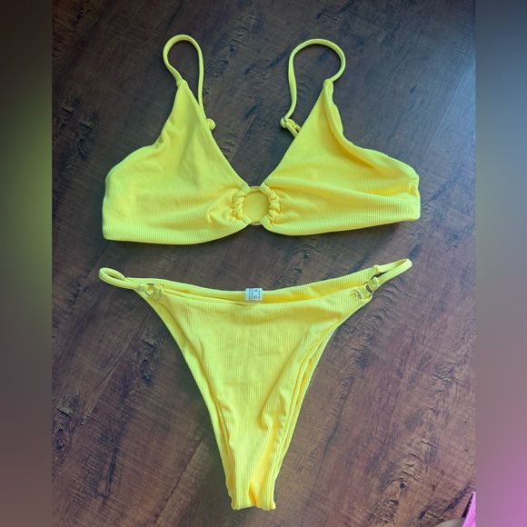 Bright yellow bikini set with a stylish ring detail. Perfect for the beach.