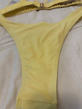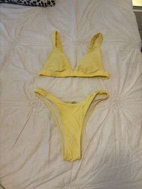 Soft yellow two-piece bikini. Triangle top and high-cut bottoms. Bright, sunny color and simple silhouette.