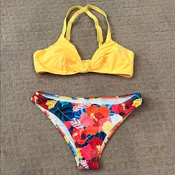 Bright yellow bikini top with a vibrant floral bottom. Perfect for a sunny day at the beach.