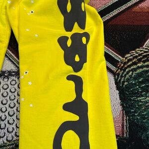 Bright yellow joggers featuring a bold black print, perfect for a stylish and comfortable look. Size med THUGGAS SP5der authentic as always priced to sell