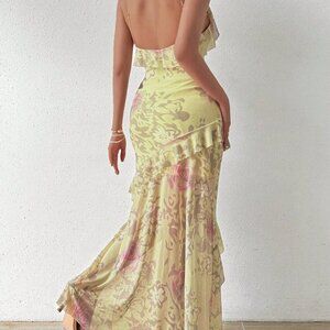 Yellow Boho Women's Beach Vacation Floral Print Ruffled Cami Dress Maxi