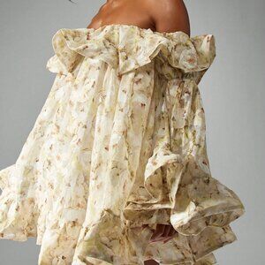 Yellow Boho Women's Chiffon Off Shoulder Floral Ruffle Bell Sleeve Mini Dress