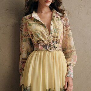 Yellow Boho Women's Floral Print Sleeve Cinched Waist Maxi Dress