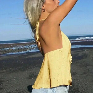 Yellow Boho Women's Summer Solid Color Front Tie Halter Neck Tank Top