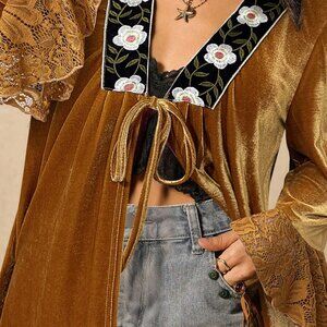 Elevate your spring and fall wardrobe with this vibrant yellow boho jacket, featuring a deep V-neck and long sleeves. The rose lace patchwork design adds a romantic touch to this regular-fit jacket, perfect for layering on crisp mornings and breezy evenings.