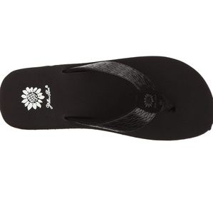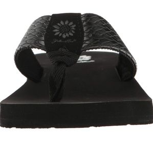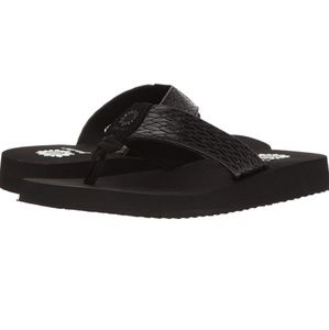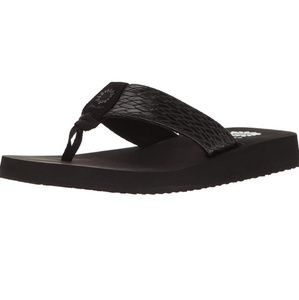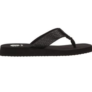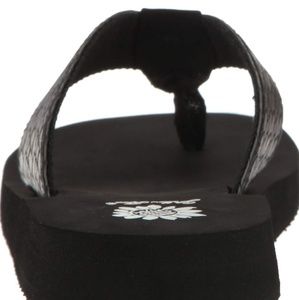 A yellow box classic flip flop wedge in a rich cross stich embossed manmade material. hit the beach, lunch or travel in style