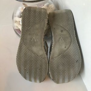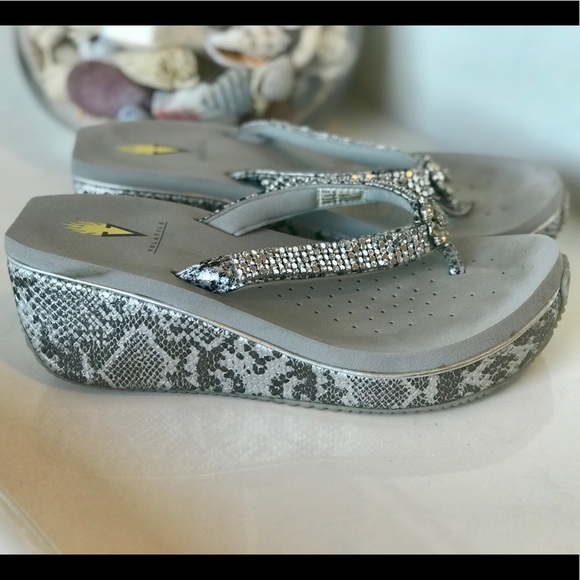 Metallic snake print with bling beading on straps. Worn a handful of times.