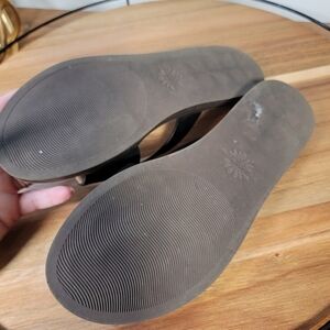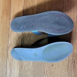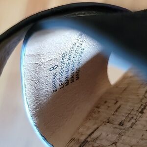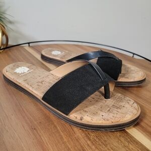 Contemporary, confy flat sandals with black suede upper band and leather crossover toe post. Cork covereved comfy, padded insoles. Rubber outsoles.