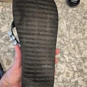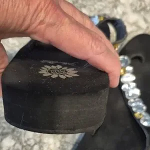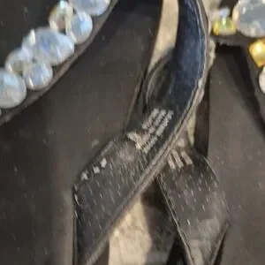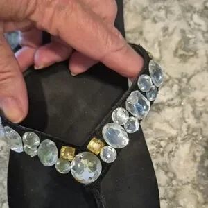 Chic black sandals with sparkling rhinestones and gold details. Perfect for adding a touch of elegance.