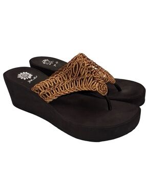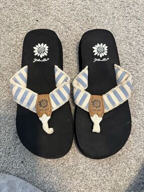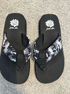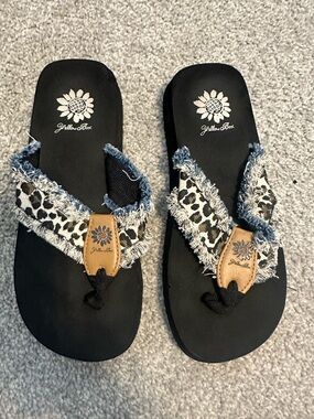 Add some sparkle to your summer style with these Yellow Box women’s flip flop sandals. Featuring a black base with glittery straps and the signature sunflower logo detail, these sandals are stylish and comfortable. Gently worn, still in great condition.