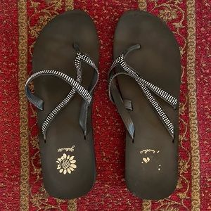 Yellow Box black rhinestone flip flops. Have been worn multiple times and been in storage (that’s why the straps look odd until they’re on) but are in great condition! Super comfortable and cute! Comment any questions. Make an offer or buy!😄